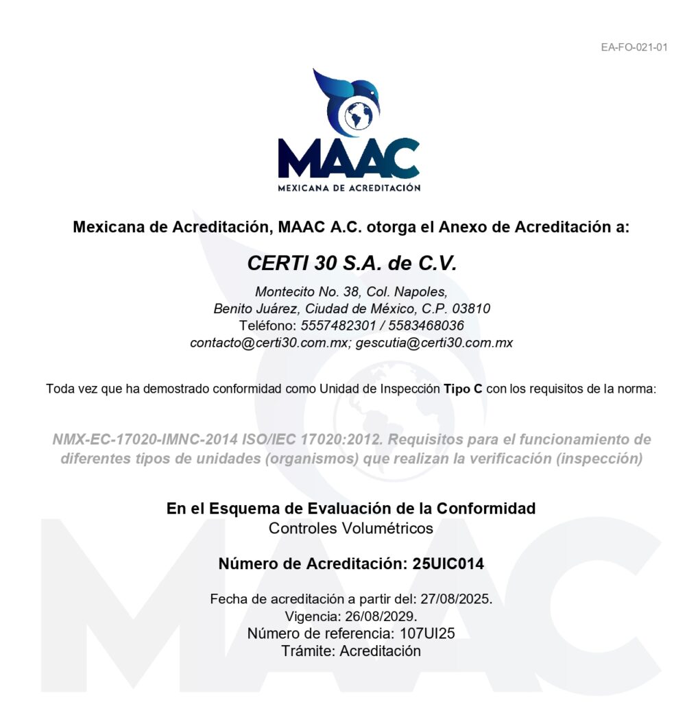 CERTI 30 opera como una Unidad de Inspección acreditada por la MAAC, con autoridad legal para examinar y certificar el cumplimiento de obligaciones de controles volumétricos conforme a la RMF 2024.